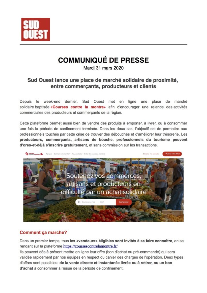 Communiqué SUD OUEST lance sa plateforme solidaire