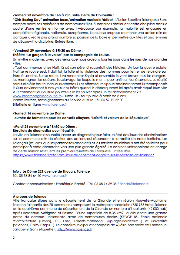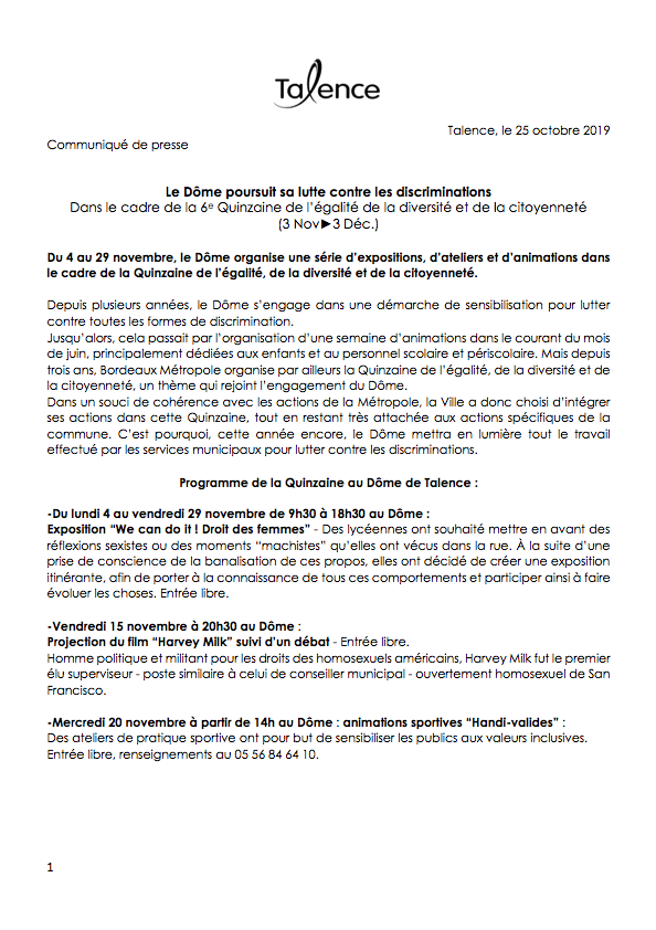 Communiqué de presse de la Quinzaine de l’égalité, de la diversité et de la citoyenneté au Dôme de Talence, du 4 au 29 novembre (format pdf) : cp-talence-quinzaine-de-legalite-de-la-diversite-de-la-citoyennete-octobre-2019