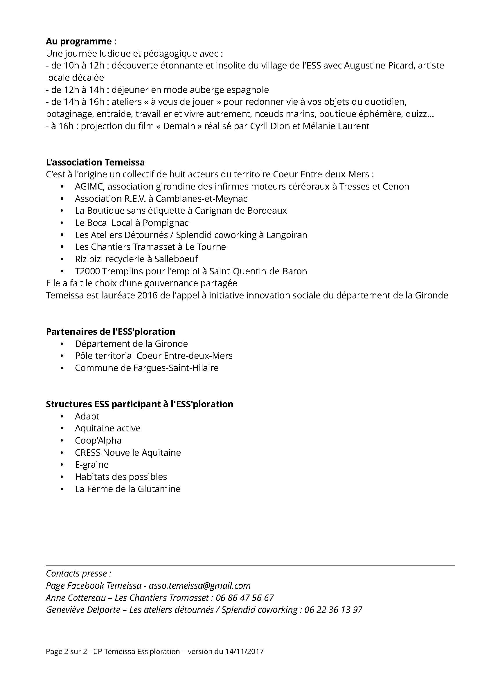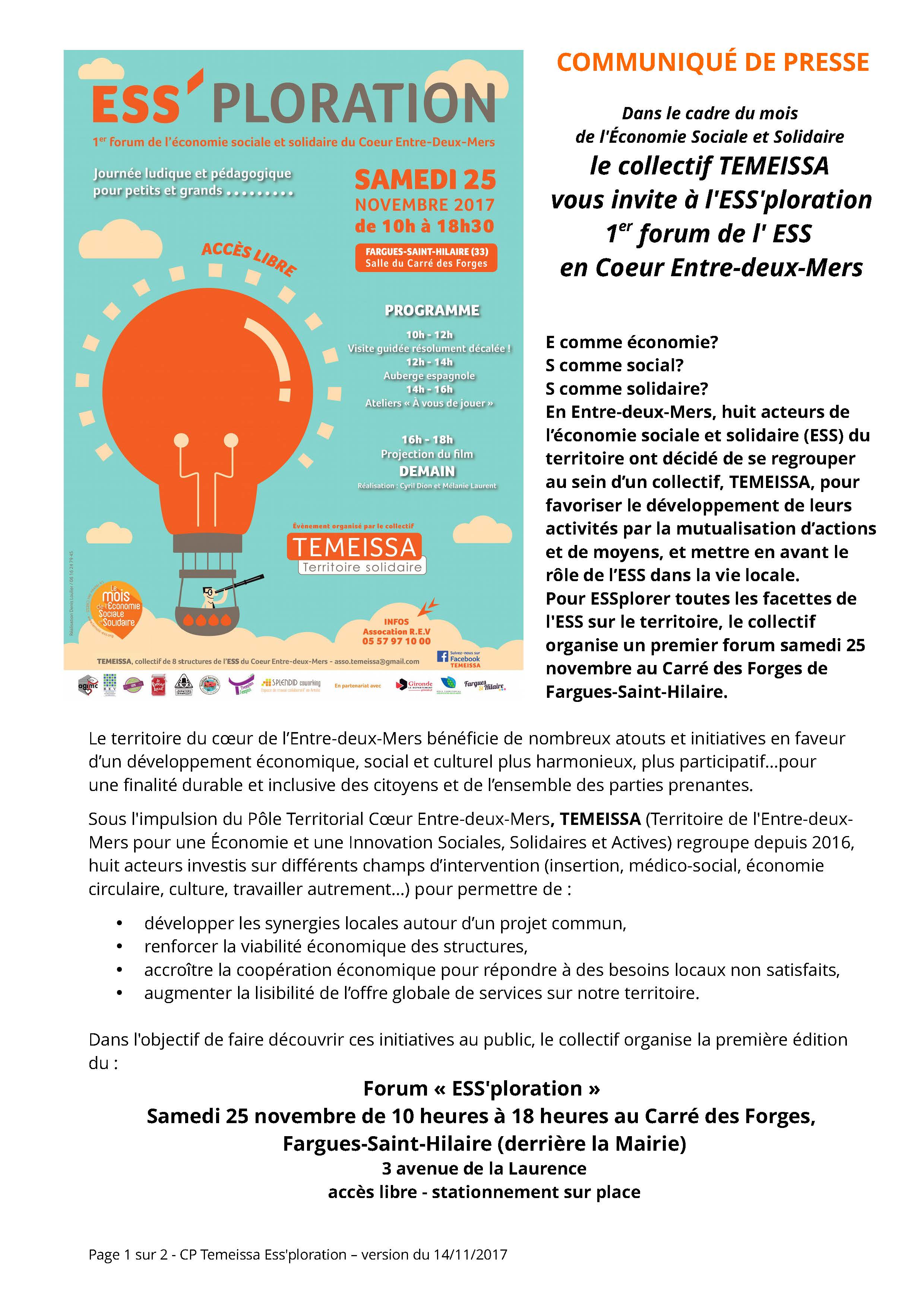 Bonjour, Nous avons le plaisir de vous transmettre ci-joint un communiqué de presse dans le cadre du mois de l’ESS. Notre collectif Temeissa organise son 1er Forum : ESSploration samedi 25 novembre de 10h à 18h30 au Carré des Forges à Fargues St Hilaire sous la forme d’une journée ludique et pédagogique L’association Temeissa, c’est lire la suite