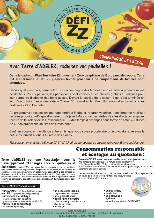 Dans le cadre du Plan Territoire Zéro déchet – Zéro gaspillage de Bordeaux Métropole, Terre d’ADELES lance le Défi ZZ jusqu’en février prochain. Une cinquantaine de familles sont attendues.
