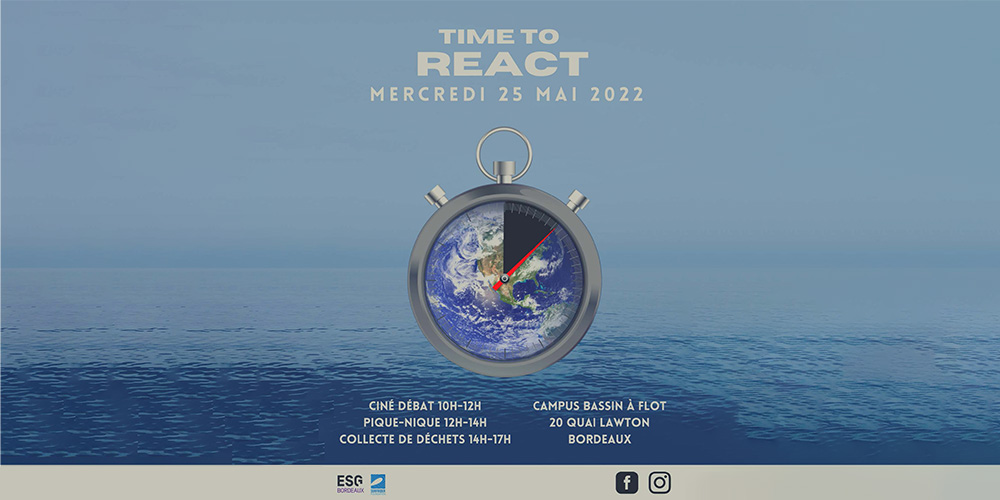Time To React est un événement de sensibilisation à la protection de l’océan. Organisé à l’initiative des étudiants en B3 COM à l’ESG Bordeaux, il aura lieu le mercredi 25 mai à partir de 10h aux Bassins à flot. L'évènement est ouvert au grand public.