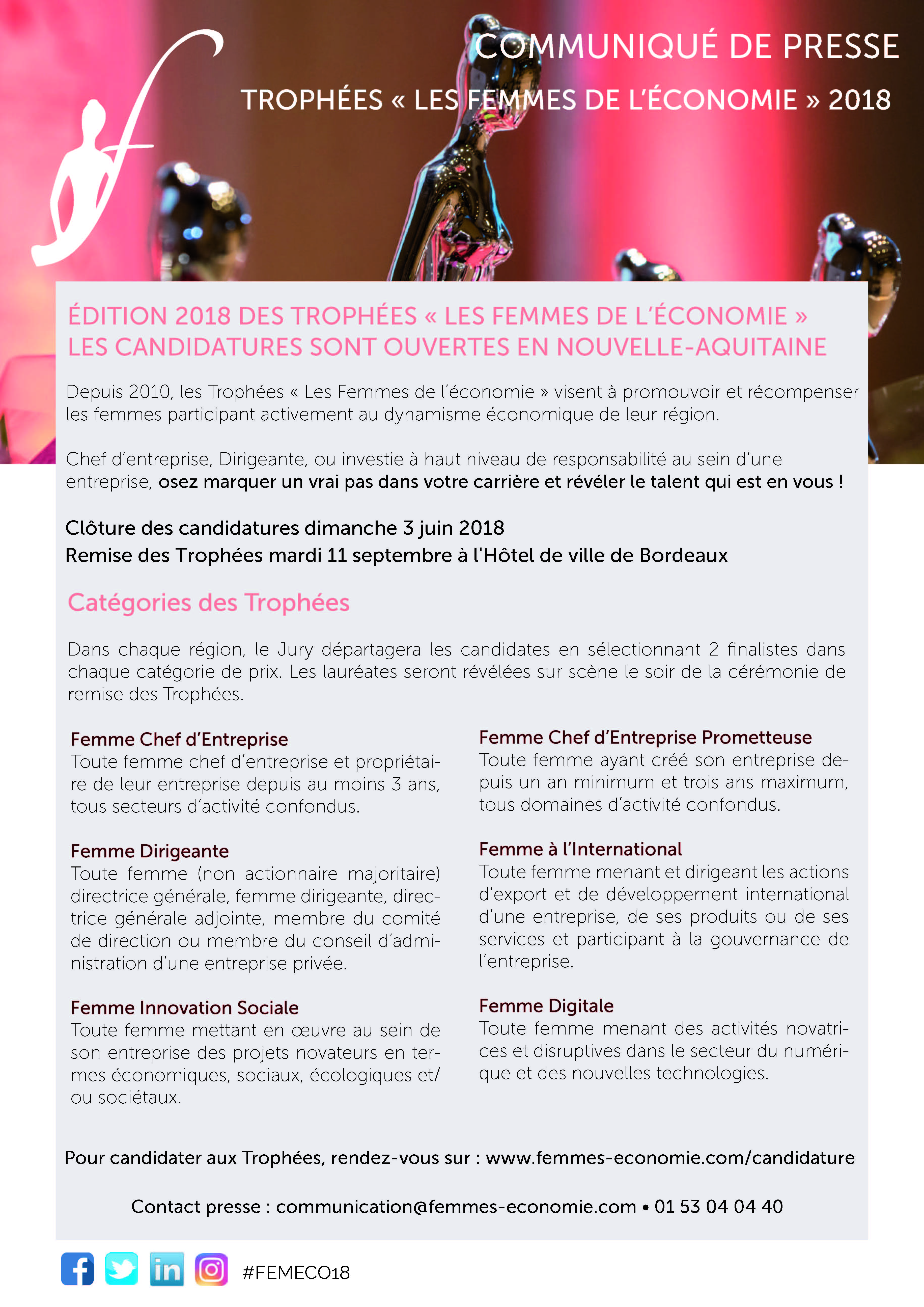 Accueil > Communiqués > Trophées des Femmes de l’économie : ouverture de l’édition Nouvelle-Aquitaine 2018