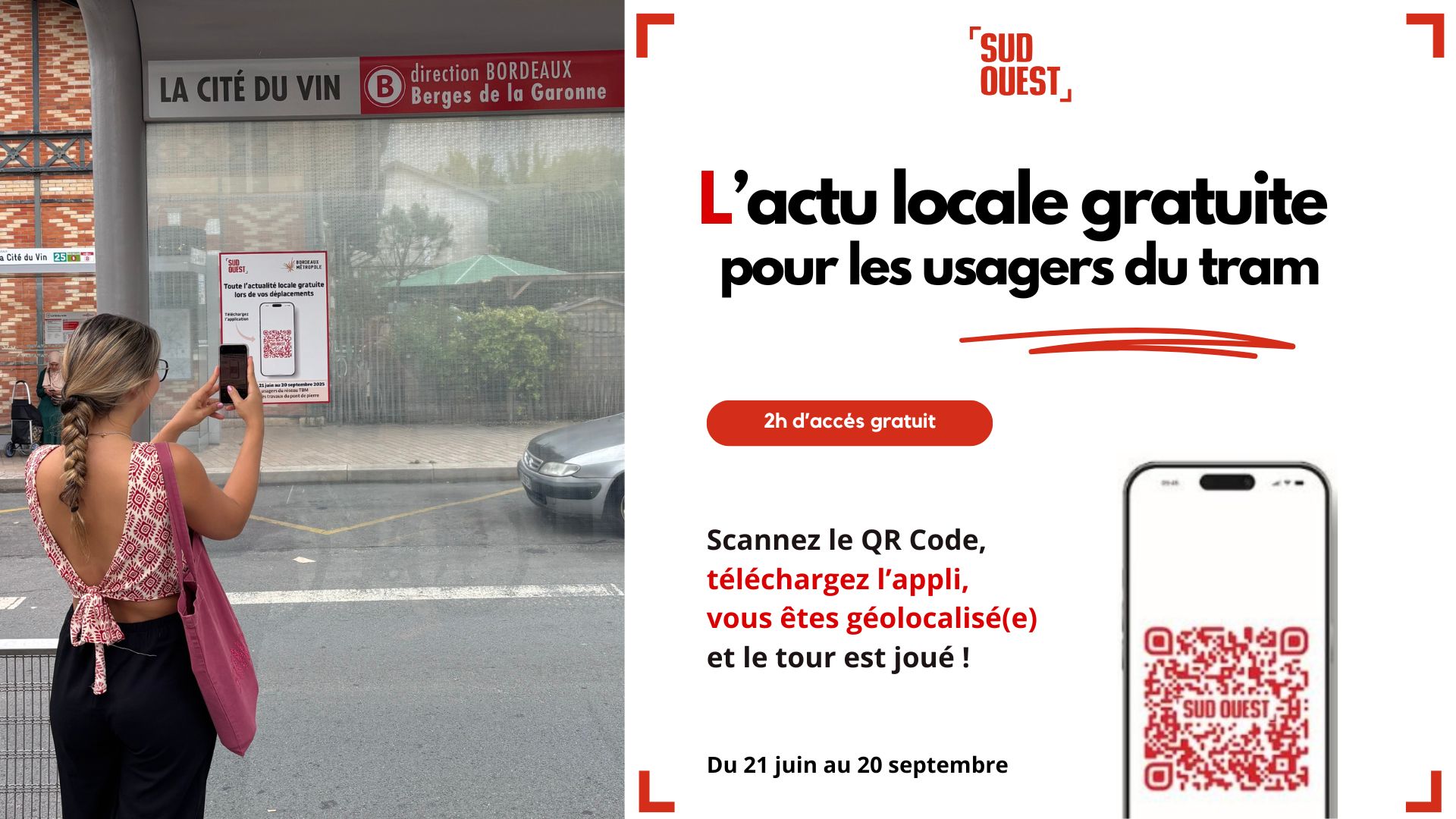 Aux abords de ces stations, les voyageurs qui disposent de l’application Sud Ouest sur leur smartphone sont invités à se géolocaliser pour pouvoir accéder gratuitement et pendant deux heures aux contenus de Sud Ouest. Pour les autres, rien de plus simple ! Il leur suffit de flasher le QR Code affiché en station pour télécharger l’application Sud Ouest puis lire les actualités du jour.