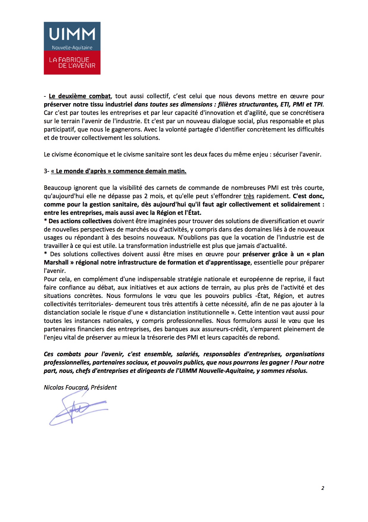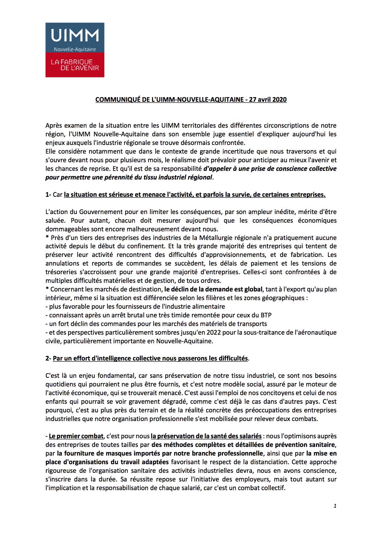 Communiqué UIMM Nouvelle-Aquitaine 27.04.2020