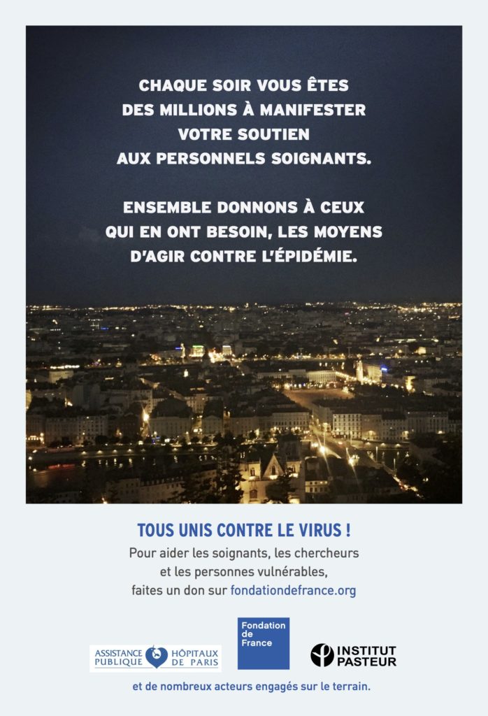 Au regard de l’ampleur des besoins, la Fondation de France, l’AP-HP et l’Institut Pasteur, se mobilisent sous la bannière « Tous unis contre le virus » et lancent une campagne d’appel à la générosité pour venir en aide aux personnels soignants, en milieu hospitalier ou non, aux chercheurs qui travaillent sans relâche pour lutter contre cette épidémie, ainsi qu’aux acteurs de terrain qui œuvrent auprès des personnes les plus vulnérables et isolées, en particulier nos aînés. Dans notre région, la Fondation de France Sud-Ouest appelle donc toutes les chaînes et radios régionales à bien vouloir diffuser gracieusement un spot TV ou radio ainsi qu’une annonce presse (ci-joints) afin d’informer l’ensemble du territoire de cette collecte de dons. Pourriez-vous nous aider à relayer cette demande ? L’équipe de la Fondation de France Sud-Ouest se tient à votre disposition si vous souhaitez vous impliquer et mobiliser votre structure ou si vos publics manifestent l’envie d’agir avec nous. N’hésitez pas à contacter Marion Dolley au 05 57 14 24 17 ou par mail marion.dolley@fdf.org Merci pour votre générosité. Très cordialement,