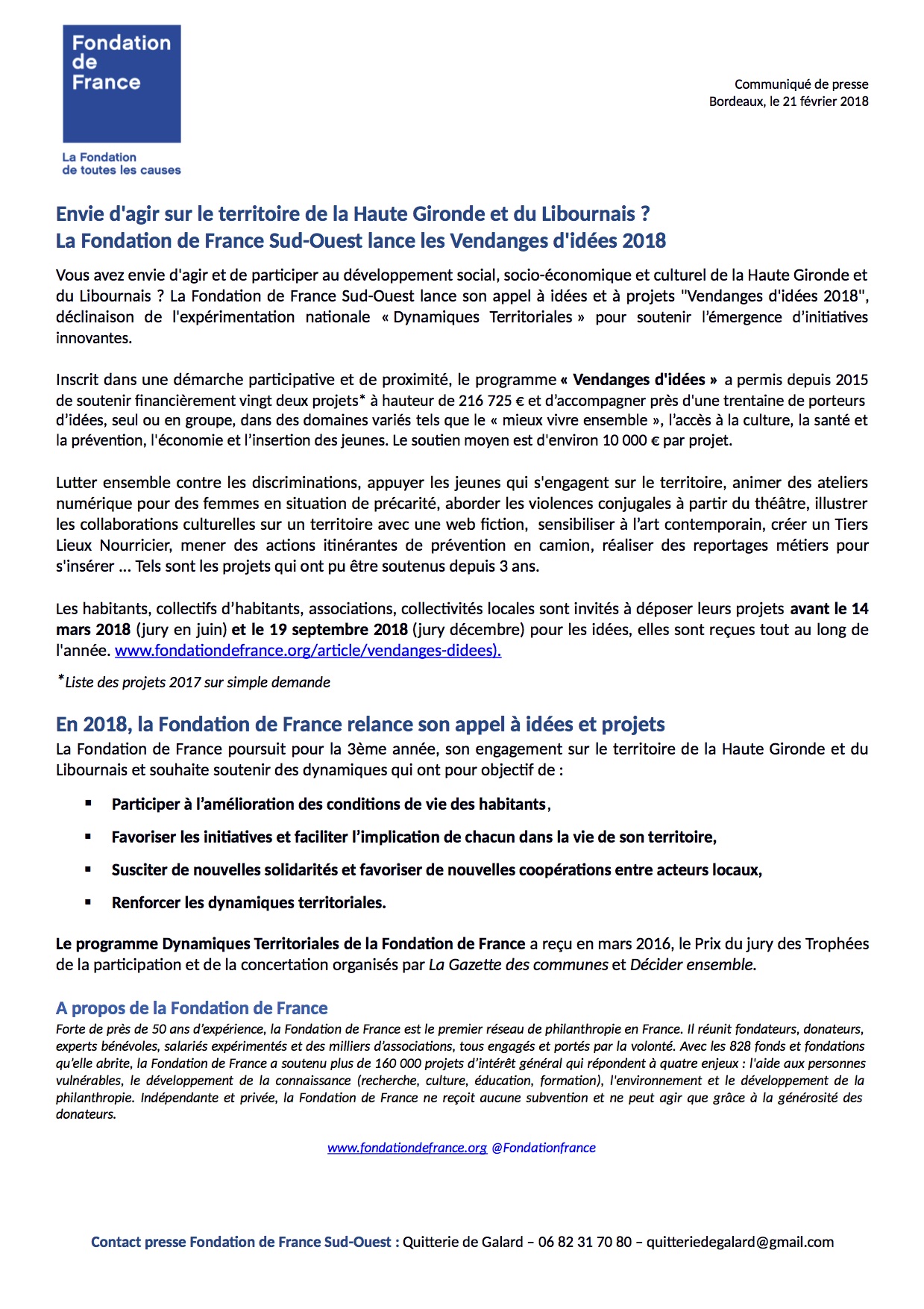 Je vous adresse en fichier joint, le Communiqué de presse de lancement des Vendanges d’idées 2018 de la Fondation de France Sud-Ouest, la date de limite de réception des dossiers avant le 14 mars (jury en juin) et le 19 septembre (jury en décembre). Les porteurs d’idées peuvent déposer leur dossier tout au long de l’année.
