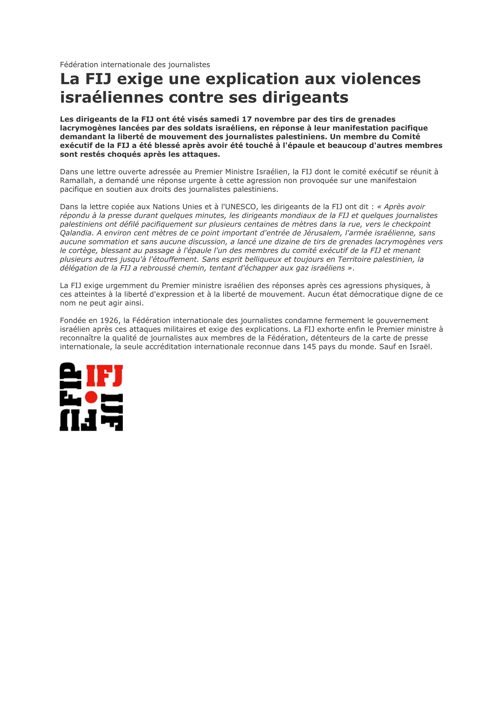 Accueil > Communiqués > Violences israéliennes contre la FIJ en Palestine