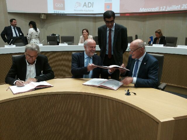 Nous avons le plaisir de vous transmettre ci-joint le dossier de presse réalisé à l’occasion de la visite de M. Bruno Lechevin, président de l’ADEME, à Bordeaux le 12 juillet, accompagné d’une photo illustrant la signature des conventions entre l’ADEME et des acteurs régionaux majeurs, dont le Conseil régional présidé par M. Alain Rousset.