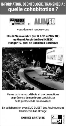 Le Club de la presse de Bordeaux et l’Alimso, association des lecteurs internautes, mobinautes de Sud Ouest, ont le plaisir de vous convier à une Soirée spéciale le 26 novembre 2013 de 17h30 à 20h30 à l’INSEEC, Hangar 19, quai de Bacalan à Bordeaux. Le lecteur, spectateur n’est plus un consommateur « facile » de l’information. Il lire la suite