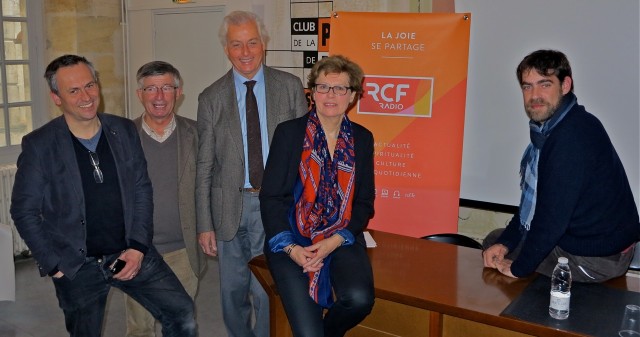 Photo 1 : Emmanuel Labails, animateur, et Michèle de Brugière; Photo 2: L’équipe RCF Bordeaux, de gauche à droite: Pascal Théozet, Henri Gilbert, Bernard d’Echallens, Michèle de Brugière, Emmanuel Labails; Photo 3:Bernard d’Echallens