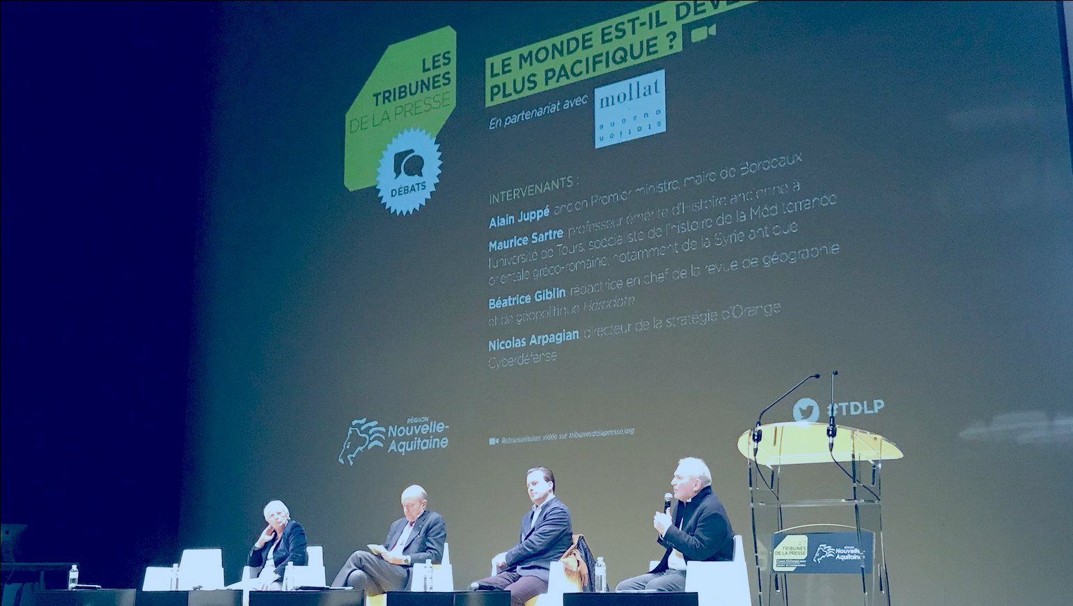 Le premier débat du vendredi a permis au maire de Bordeaux, ancien premier ministre, de revenir sur son rôle de ministre des Affaires étrangères, sur la question : “Le monde est-il plus pacifique ?“ Avec Béatrice Giblin, rédactrice en chef de la revue Hérodote et Nicolas Arpagian, directeur à Orange Cyberdéfense.